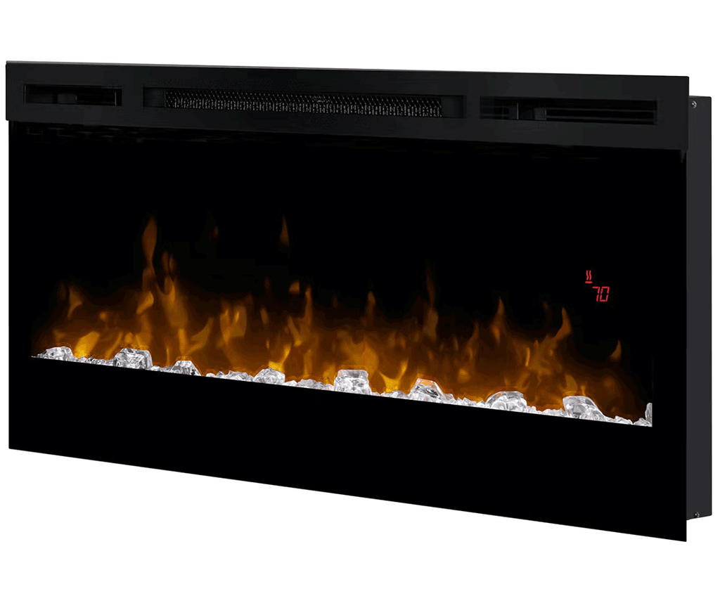 Like this 34″ wide version, Prism linear electric fireplaces make a sparkling addition to your wall. Literally, since its flames arise from a bed of diamond-like decoration which can be illuminated in many colors, to suit your mood. With its remote control and a powerful and efficient fan-forced heater, this fireplace adds comfort and ambiance to any space. Plugged in or hard-wired, hung on the wall or built-in; the Dimplex Prism is beautifully versatile, with a choice of three different widths.